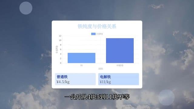 ·最常见的普通工业铁,用于建筑和机械制造,每公斤大约2.5元左右,这个价格近年来一直比较稳定。但如果换成高纯度铁,比如电解铁,价格就会大幅上涨,每公斤在4.5元到11元之间,纯度越高,价格越高。