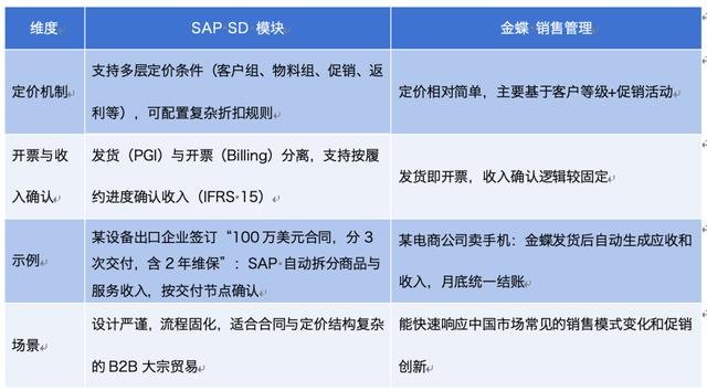 SAP支持复杂的收入拆分和国际准则合规,金蝶则更适合灵活多变的销售模式。
