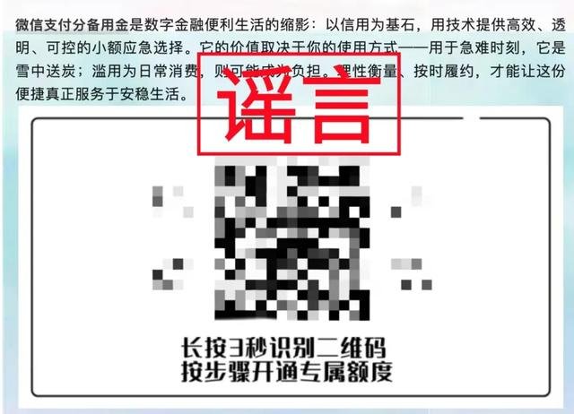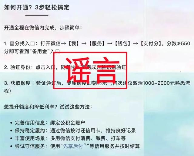 经调查确认,以上信息为虚假内容。这些文章冒用“微信支付分”和“微众银行”的名义,宣称“支付分可以领取备用金”或“达到分数即可提现”,均为不实信息。