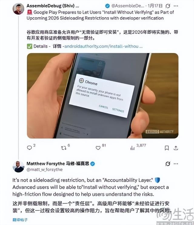 最近,谷歌Play Store开发者体验产品管理总监Matthew Forsyth在社交平台上透露,即将推出一套针对侧载的“高阻力”安装流程。这并非直接限制侧载功能,而是设置了一道“责任层”。高级用户仍可选择跳过验证直接安装,但未来侧载将需要完成更复杂的步骤,目的是让用户清楚了解通过非官方渠道安装应用可能面临的风险。
