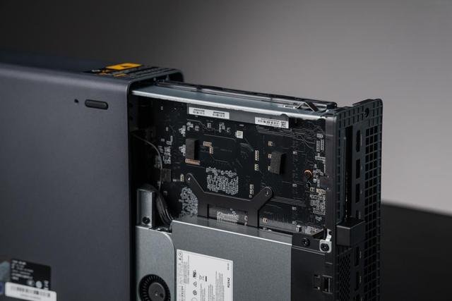 主机采用快拆设计,滑轨结构使一体化主板盘可轻松取出,便于升级和维护。内部配备双M.2插槽,支持PCIe 4.0(×4和×1),最大支持8TB×2容量扩展。此外,还提供一个PCIe 4.0×4的全长插槽,方便玩家扩展半高扩展卡。