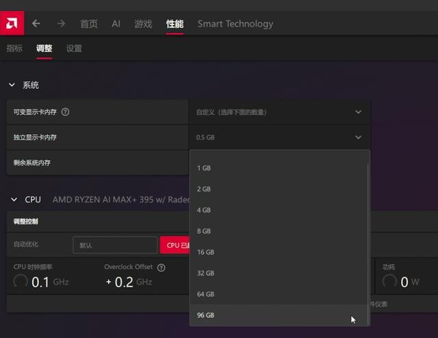 铭凡MS-S1 MAX搭载128GB统一内存,可在AMD控制中心手动分配显存容量。常规测试中,我们使用64GB系统内存+64GB显存的方案。而在AI测试中,根据模型需求进行调整。主机设置为性能模式,以确保最大性能输出。