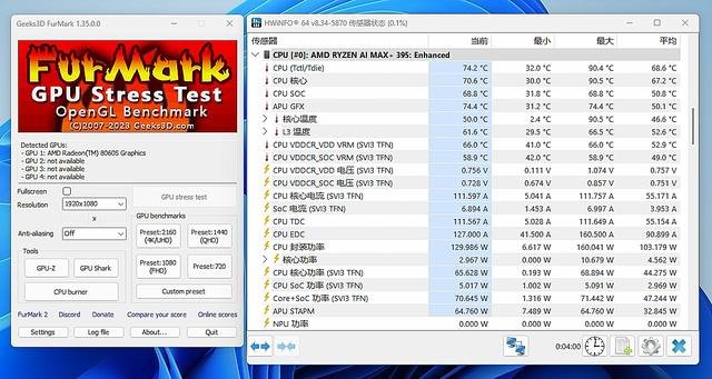 首先看性能释放。在双考模式下,铭凡MS-S1 MAX的处理器封装功率峰值达到了标称的160W,持续值为130W。半小时考机后,处理器温度未超过80℃(环境温度24℃)。单考时,峰值和持续值同样为160W和130W,但温度略高,达到87℃。值得称赞的是,即使满负荷运行,铭凡MS-S1 MAX的噪音控制也很出色,在同类产品中表现优异。