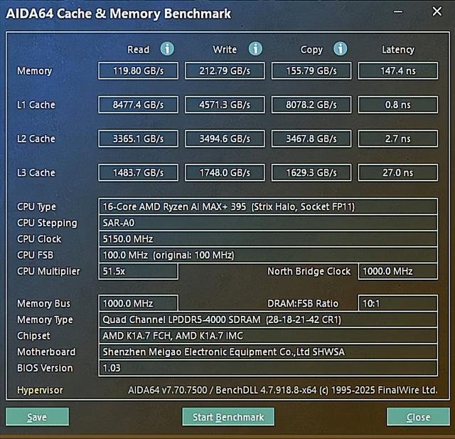▲锐龙AI MAX+ 395配备的128GB LPDDR5X 8000内存性能非常出色