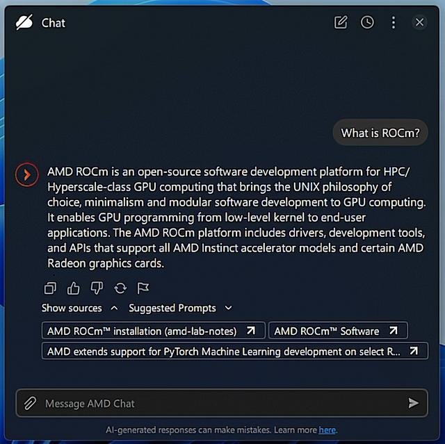 ▲AMD驱动控制中心提供专属AI Chat工具,利用Radeon 8060S提供算力支持