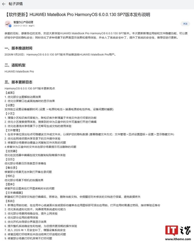 IT之家 1 月 21 日消息,华为 MateBook Pro 鸿蒙电脑今日正式宣布推出 HarmonyOS 6.0.0.130 SP7 版本的系统升级。据悉,此次更新引入了应用锁和文件隐藏功能,并对多个使用场景下的界面显示进行了优化,同时整合了最新的系统安全补丁。