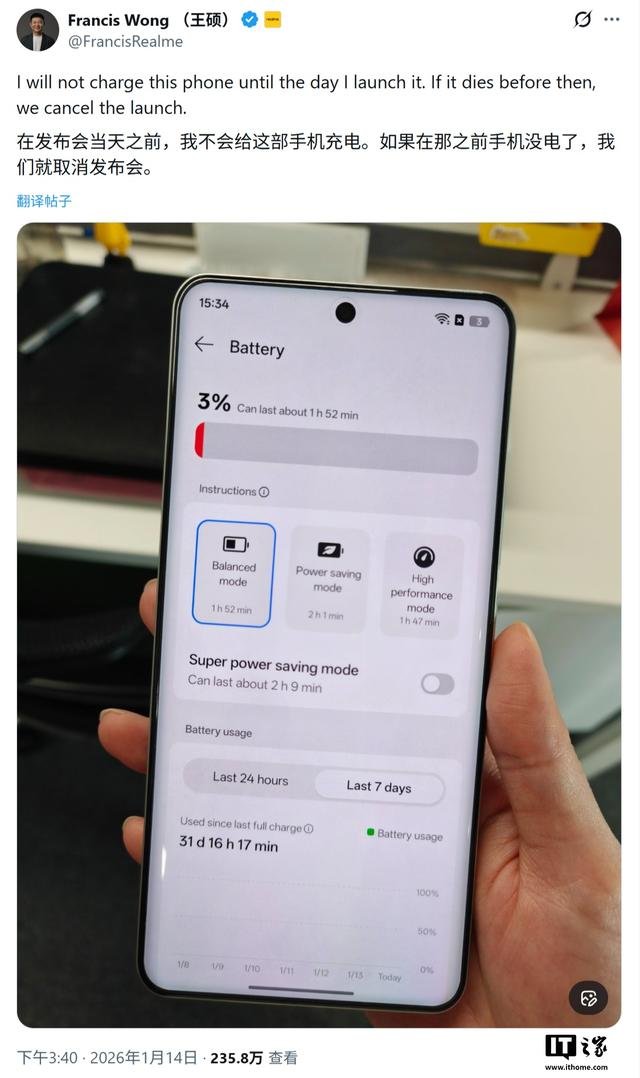 realme 产品营销负责人王硕于 1 月 14 日在社交平台 X 上分享了一张疑似 P4 Power 的电池使用截图,展示了其在“均衡模式”下令人惊叹的续航表现。
