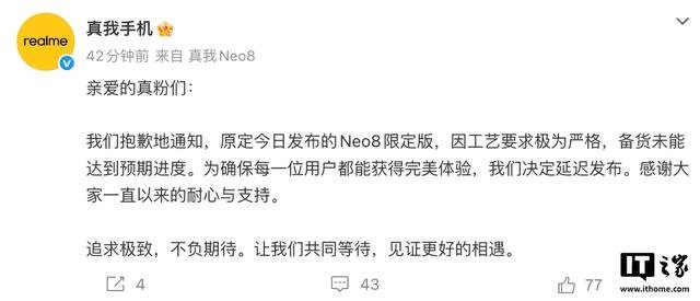 IT之家 1 月 22 日消息,据“真我手机”官方微博透露,原定于今日发布的“realme 真我 Neo8 限定版”因工艺复杂、备货未达预期,决定推迟发布。