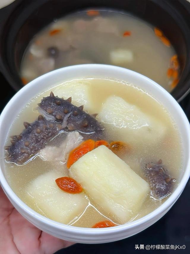 第二道适合中午或晚上食用,山药海参猪骨汤。提前将猪骨焯水,去除血沫,再与山药和泡发好的海参一同放入砂锅中,加入足够的水,大火烧开后转小火慢炖1小时,最后加盐调味即可。这道汤口感清爽不油腻,猪骨能补充体力,山药润燥,非常适合冬天饮用,一家人都可以享用,搭配主食非常方便。