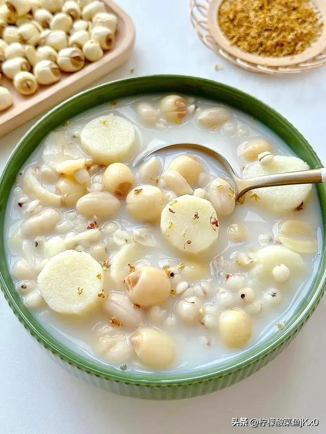 第三道可以作为早餐或晚餐的粥品,莲子百合山药薏米粥。提前将薏米泡一小时,然后与莲子、百合、山药块和大米一起放入锅中,加水煮40分钟即可。莲子和百合煮至软烂后,味道清甜,无需额外加糖也十分美味。薏米与山药的搭配,让这道粥既营养又不油腻,特别适合消化功能较弱的人群,一次煮一锅可分两餐食用,省时又省力。
