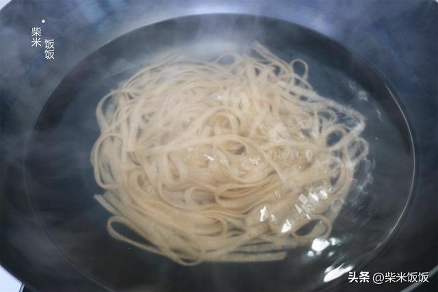 3,将红薯粉条清洗干净,水开后下锅煮。这里用的是宽粉,大约需要六分钟才能煮熟。如果时间充裕,可以提前泡软,开水煮半分钟即可。