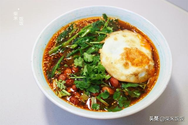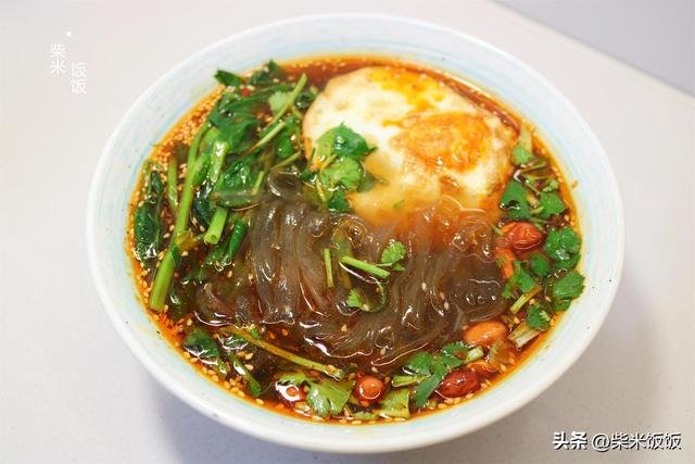 7,最后撒上油炸花生米和香菜,再加个煎蛋,一碗热气腾腾的酸辣粉就完成了。