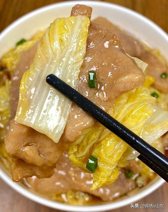 4. 将肉片平铺在白菜上。
