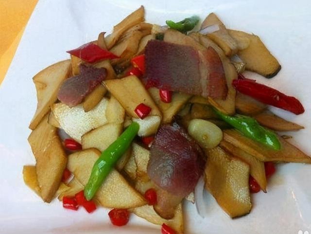 材料:腊肉、杏鲍菇、姜丝、葱花、酱油、醋和盐