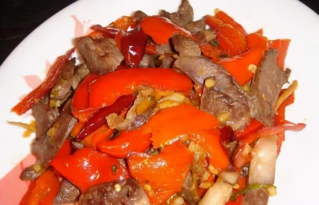 6.加入猪心片煸炒,再加入辣椒粉、盐、味精。