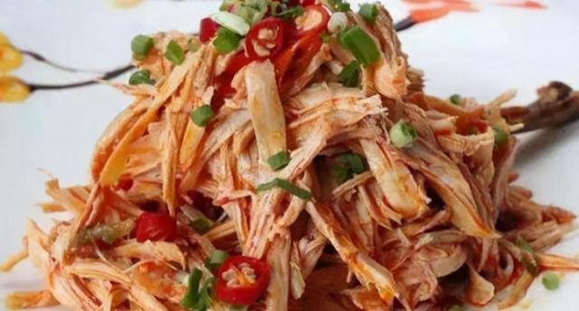 3、鸡撕成条,加入木耳和调味汁拌匀。