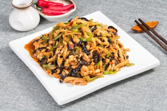 第二道,鱼香肉丝。将瘦肉切成细丝并用调料腌制,同时准备青椒、木耳和胡萝卜丝。调制一碗鱼香酱汁,先将肉丝炒至变色,再加入配菜翻炒,最后倒入酱汁,酸辣开胃,令人食欲大增。