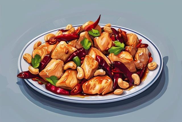 第三道,宫保鸡丁。鸡胸肉切丁后腌制入味,花生米炸至酥脆备用。先将鸡肉炒至变色,再加入葱段和辣椒段,倒入特制酱汁,最后撒入花生米,香辣可口,回味无穷。