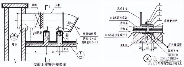 4)风管与砖、混凝土风道连接口应顺着气流方向插入,并采取密封措施。风管穿屋面处应设防雨装置,不得渗漏。