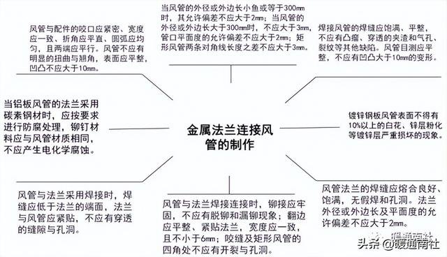 金属风管水平安装时,直径或边长小于等于400mm,间距不超过4m;大于400mm时,间距不超过3m。薄钢管法兰风管的支吊架间距不超过3m。垂直安装时至少设置两个固定点,间距不超过4m。